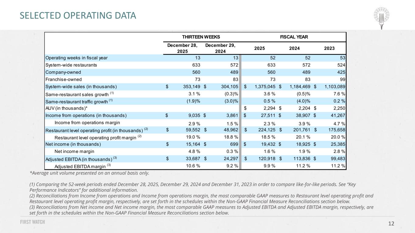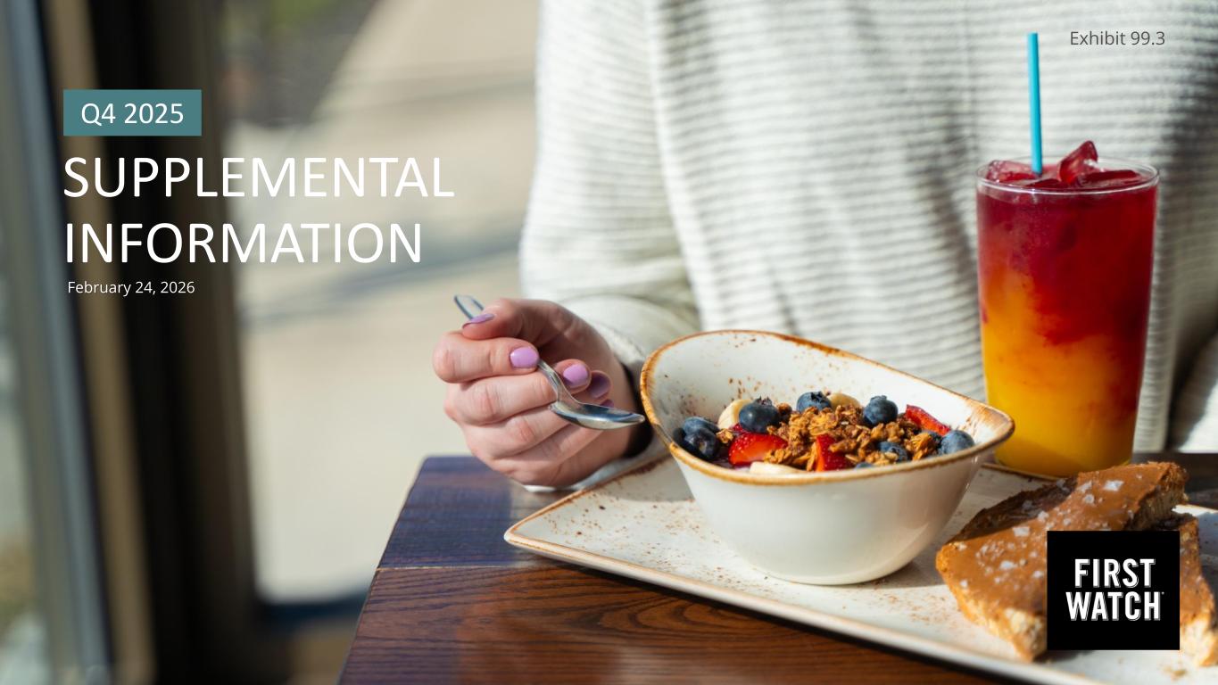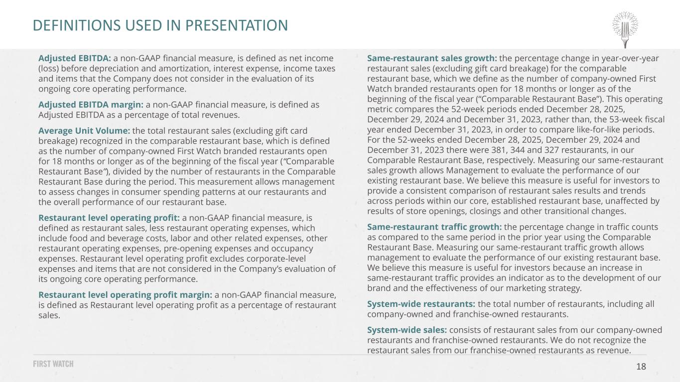 18 Adjusted EBITDA: a non-GAAP financial measure, is defined as net income (loss) before depreciation and amortization, interest expense, income taxes and items that the Company does not consider in the evaluation of its ongoing core operating performance. Adjusted EBITDA margin: a non-GAAP financial measure, is defined as Adjusted EBITDA as a percentage of total revenues. Average Unit Volume: the total restaurant sales (excluding gift card breakage) recognized in the comparable restaurant base, which is defined as the number of company-owned First Watch branded restaurants open for 18 months or longer as of the beginning of the fiscal year (“Comparable Restaurant Base”), divided by the number of restaurants in the Comparable Restaurant Base during the period. This measurement allows management to assess changes in consumer spending patterns at our restaurants and the overall performance of our restaurant base. Restaurant level operating profit: a non-GAAP financial measure, is defined as restaurant sales, less restaurant operating expenses, which include food and beverage costs, labor and other related expenses, other restaurant operating expenses, pre-opening expenses and occupancy expenses. Restaurant level operating profit excludes corporate-level expenses and items that are not considered in the Company’s evaluation of its ongoing core operating performance. Restaurant level operating profit margin: a non-GAAP financial measure, is defined as Restaurant level operating profit as a percentage of restaurant sales. Same-restaurant sales growth: the percentage change in year-over-year restaurant sales (excluding gift card breakage) for the comparable restaurant base, which we define as the number of company-owned First Watch branded restaurants open for 18 months or longer as of the beginning of the fiscal year (“Comparable Restaurant Base”). This operating metric compares the 52-week periods ended December 28, 2025, December 29, 2024 and December 31, 2023, rather than, the 53-week fiscal year ended December 31, 2023, in order to compare like-for-like periods. For the 52-weeks ended December 28, 2025, December 29, 2024 and December 31, 2023 there were 381, 344 and 327 restaurants, in our Comparable Restaurant Base, respectively. Measuring our same-restaurant sales growth allows Management to evaluate the performance of our existing restaurant base. We believe this measure is useful for investors to provide a consistent comparison of restaurant sales results and trends across periods within our core, established restaurant base, unaffected by results of store openings, closings and other transitional changes. Same-restaurant traffic growth: the percentage change in traffic counts as compared to the same period in the prior year using the Comparable Restaurant Base. Measuring our same-restaurant traffic growth allows management to evaluate the performance of our existing restaurant base. We believe this measure is useful for investors because an increase in same-restaurant traffic provides an indicator as to the development of our brand and the effectiveness of our marketing strategy. System-wide restaurants: the total number of restaurants, including all company-owned and franchise-owned restaurants. System-wide sales: consists of restaurant sales from our company-owned restaurants and franchise-owned restaurants. We do not recognize the restaurant sales from our franchise-owned restaurants as revenue. DEFINITIONS USED IN PRESENTATION