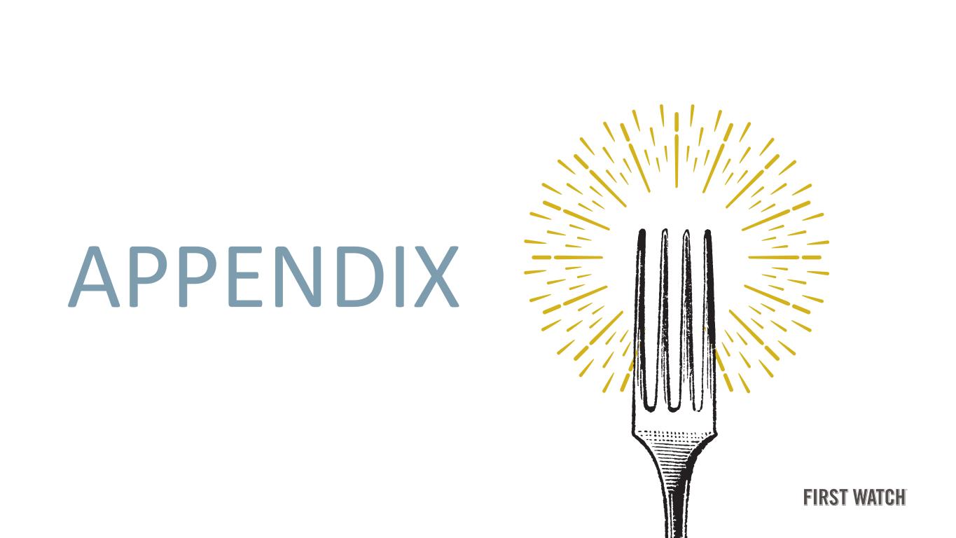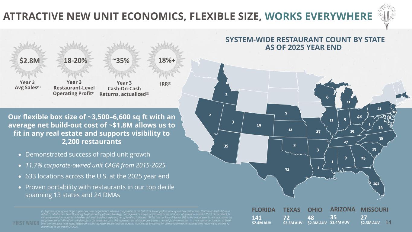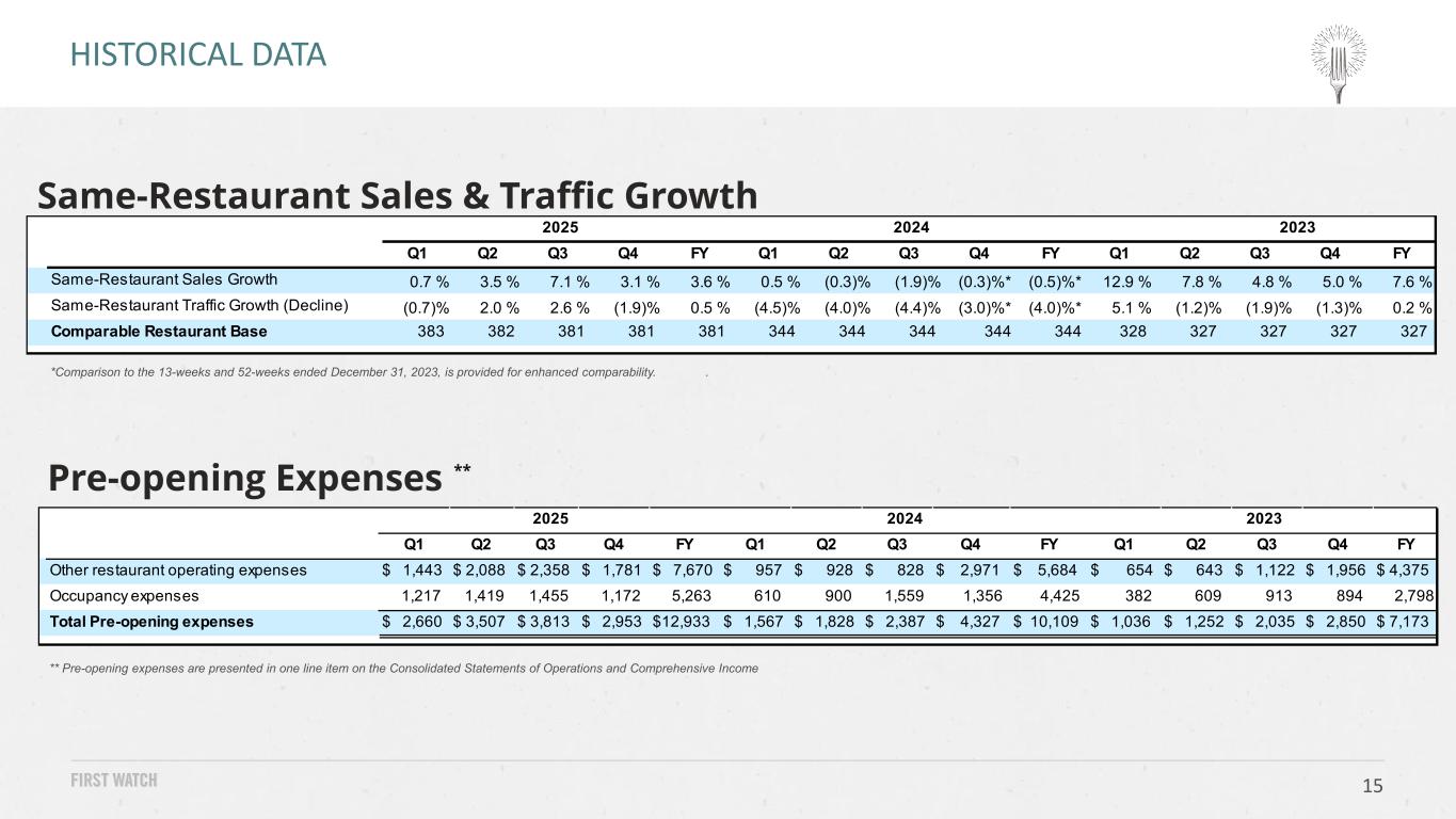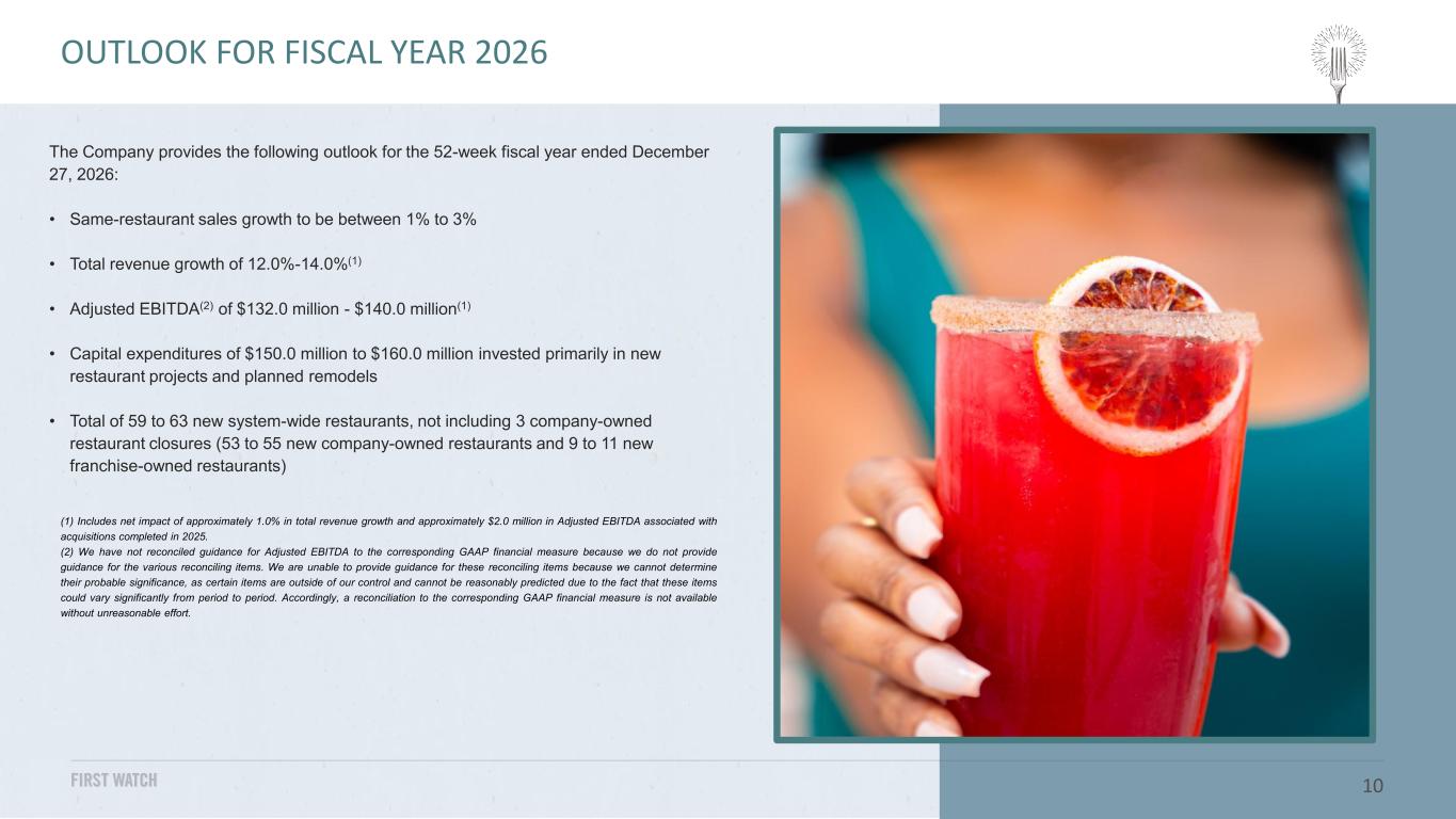 18 Adjusted EBITDA: a non-GAAP financial measure, is defined as net income (loss) before depreciation and amortization, interest expense, income taxes and items that the Company does not consider in the evaluation of its ongoing core operating performance. Adjusted EBITDA margin: a non-GAAP financial measure, is defined as Adjusted EBITDA as a percentage of total revenues. Average Unit Volume: the total restaurant sales (excluding gift card breakage) recognized in the comparable restaurant base, which is defined as the number of company-owned First Watch branded restaurants open for 18 months or longer as of the beginning of the fiscal year (“Comparable Restaurant Base”), divided by the number of restaurants in the Comparable Restaurant Base during the period. This measurement allows management to assess changes in consumer spending patterns at our restaurants and the overall performance of our restaurant base. Restaurant level operating profit: a non-GAAP financial measure, is defined as restaurant sales, less restaurant operating expenses, which include food and beverage costs, labor and other related expenses, other restaurant operating expenses, pre-opening expenses and occupancy expenses. Restaurant level operating profit excludes corporate-level expenses and items that are not considered in the Company’s evaluation of its ongoing core operating performance. Restaurant level operating profit margin: a non-GAAP financial measure, is defined as Restaurant level operating profit as a percentage of restaurant sales. Same-restaurant sales growth: the percentage change in year-over-year restaurant sales (excluding gift card breakage) for the comparable restaurant base, which we define as the number of company-owned First Watch branded restaurants open for 18 months or longer as of the beginning of the fiscal year (“Comparable Restaurant Base”). This operating metric compares the 52-week periods ended December 28, 2025, December 29, 2024 and December 31, 2023, rather than, the 53-week fiscal year ended December 31, 2023, in order to compare like-for-like periods. For the 52-weeks ended December 28, 2025, December 29, 2024 and December 31, 2023 there were 381, 344 and 327 restaurants, in our Comparable Restaurant Base, respectively. Measuring our same-restaurant sales growth allows Management to evaluate the performance of our existing restaurant base. We believe this measure is useful for investors to provide a consistent comparison of restaurant sales results and trends across periods within our core, established restaurant base, unaffected by results of store openings, closings and other transitional changes. Same-restaurant traffic growth: the percentage change in traffic counts as compared to the same period in the prior year using the Comparable Restaurant Base. Measuring our same-restaurant traffic growth allows management to evaluate the performance of our existing restaurant base. We believe this measure is useful for investors because an increase in same-restaurant traffic provides an indicator as to the development of our brand and the effectiveness of our marketing strategy. System-wide restaurants: the total number of restaurants, including all company-owned and franchise-owned restaurants. System-wide sales: consists of restaurant sales from our company-owned restaurants and franchise-owned restaurants. We do not recognize the restaurant sales from our franchise-owned restaurants as revenue. DEFINITIONS USED IN PRESENTATION