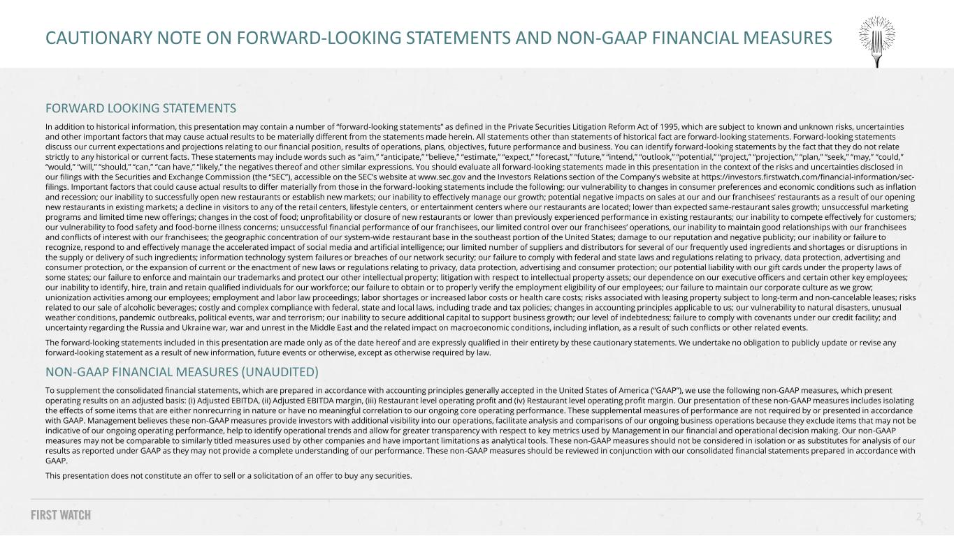 FORWARD LOOKING STATEMENTS In addition to historical information, this presentation may contain a number of “forward-looking statements” as defined in the Private Securities Litigation Reform Act of 1995, which are subject to known and unknown risks, uncertainties and other important factors that may cause actual results to be materially different from the statements made herein. All statements other than statements of historical fact are forward-looking statements. Forward-looking statements discuss our current expectations and projections relating to our financial position, results of operations, plans, objectives, future performance and business. You can identify forward-looking statements by the fact that they do not relate strictly to any historical or current facts. These statements may include words such as “aim,” “anticipate,” “believe,” “estimate,” “expect,” “forecast,” “future,” “intend,” “outlook,” “potential,” “project,” “projection,” “plan,” “seek,” “may,” “could,” “would,” “will,” “should,” “can,” “can have,” “likely,” the negatives thereof and other similar expressions. You should evaluate all forward-looking statements made in this presentation in the context of the risks and uncertainties disclosed in our filings with the Securities and Exchange Commission (the “SEC”), accessible on the SEC’s website at www.sec.gov and the Investors Relations section of the Company’s website at https://investors.firstwatch.com/financial-information/sec- filings. Important factors that could cause actual results to differ materially from those in the forward-looking statements include the following: our vulnerability to changes in consumer preferences and economic conditions such as inflation and recession; our inability to successfully open new restaurants or establish new markets; our inability to effectively manage our growth; potential negative impacts on sales at our and our franchisees’ restaurants as a result of our opening new restaurants in existing markets; a decline in visitors to any of the retail centers, lifestyle centers, or entertainment centers where our restaurants are located; lower than expected same-restaurant sales growth; unsuccessful marketing programs and limited time new offerings; changes in the cost of food; unprofitability or closure of new restaurants or lower than previously experienced performance in existing restaurants; our inability to compete effectively for customers; our vulnerability to food safety and food-borne illness concerns; unsuccessful financial performance of our franchisees, our limited control over our franchisees’ operations, our inability to maintain good relationships with our franchisees and conflicts of interest with our franchisees; the geographic concentration of our system-wide restaurant base in the southeast portion of the United States; damage to our reputation and negative publicity; our inability or failure to recognize, respond to and effectively manage the accelerated impact of social media and artificial intelligence; our limited number of suppliers and distributors for several of our frequently used ingredients and shortages or disruptions in the supply or delivery of such ingredients; information technology system failures or breaches of our network security; our failure to comply with federal and state laws and regulations relating to privacy, data protection, advertising and consumer protection, or the expansion of current or the enactment of new laws or regulations relating to privacy, data protection, advertising and consumer protection; our potential liability with our gift cards under the property laws of some states; our failure to enforce and maintain our trademarks and protect our other intellectual property; litigation with respect to intellectual property assets; our dependence on our executive officers and certain other key employees; our inability to identify, hire, train and retain qualified individuals for our workforce; our failure to obtain or to properly verify the employment eligibility of our employees; our failure to maintain our corporate culture as we grow; unionization activities among our employees; employment and labor law proceedings; labor shortages or increased labor costs or health care costs; risks associated with leasing property subject to long-term and non-cancelable leases; risks related to our sale of alcoholic beverages; costly and complex compliance with federal, state and local laws, including trade and tax policies; changes in accounting principles applicable to us; our vulnerability to natural disasters, unusual weather conditions, pandemic outbreaks, political events, war and terrorism; our inability to secure additional capital to support business growth; our level of indebtedness; failure to comply with covenants under our credit facility; and uncertainty regarding the Russia and Ukraine war, war and unrest in the Middle East and the related impact on macroeconomic conditions, including inflation, as a result of such conflicts or other related events. The forward-looking statements included in this presentation are made only as of the date hereof and are expressly qualified in their entirety by these cautionary statements. We undertake no obligation to publicly update or revise any forward-looking statement as a result of new information, future events or otherwise, except as otherwise required by law. NON-GAAP FINANCIAL MEASURES (UNAUDITED) To supplement the consolidated financial statements, which are prepared in accordance with accounting principles generally accepted in the United States of America (“GAAP”), we use the following non-GAAP measures, which present operating results on an adjusted basis: (i) Adjusted EBITDA, (ii) Adjusted EBITDA margin, (iii) Restaurant level operating profit and (iv) Restaurant level operating profit margin. Our presentation of these non-