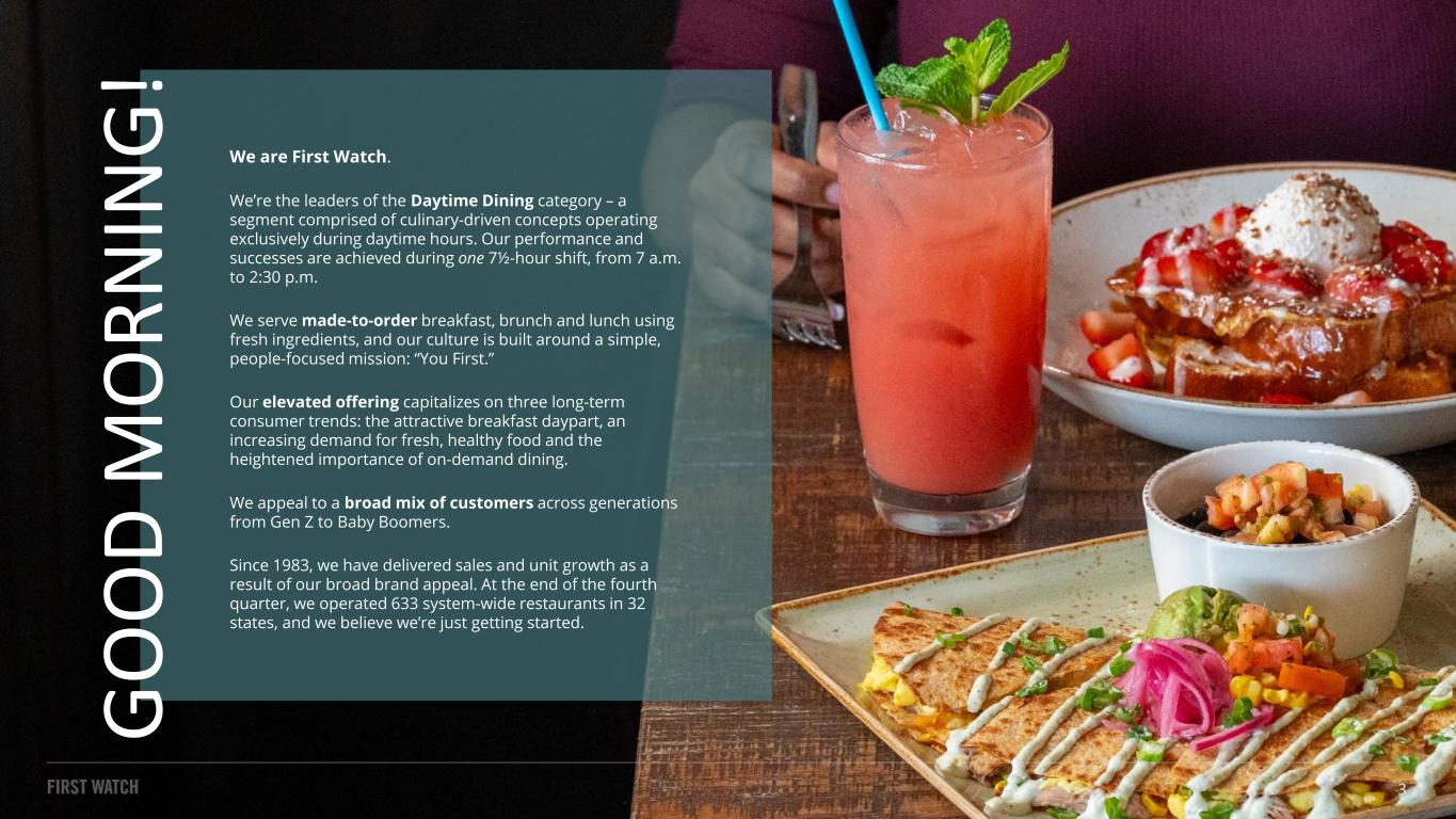 We are First Watch. We’re the leaders of the Daytime Dining category – a segment comprised of culinary-driven concepts operating exclusively during daytime hours. Our performance and successes are achieved during one 7½-hour shift, from 7 a.m. to 2:30 p.m. We serve made-to-order breakfast, brunch and lunch using fresh ingredients, and our culture is built around a simple, people-focused mission: “You First.” Our elevated offering capitalizes on three long-term consumer trends: the attractive breakfast daypart, an increasing demand for fresh, healthy food and the heightened importance of on-demand dining. We appeal to a broad mix of customers across generations from Gen Z to Baby Boomers. Since 1983, we have delivered sales and unit growth as a result of our broad brand appeal. At the end of the fourth quarter, we operated 633 system-wide restaurants in 32 states, and we believe we’re just getting started. G O O D M O R N IN G ! 3