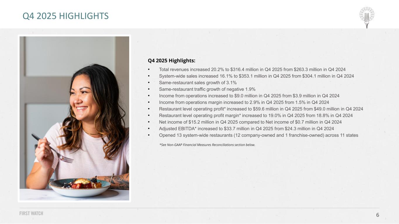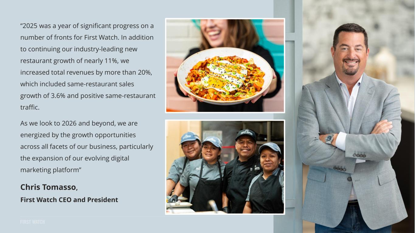 “2025 was a year of significant progress on a number of fronts for First Watch. In addition to continuing our industry-leading new restaurant growth of nearly 11%, we increased total revenues by more than 20%, which included same-restaurant sales growth of 3.6% and positive same-restaurant traffic. As we look to 2026 and beyond, we are energized by the growth opportunities across all facets of our business, particularly the expansion of our evolving digital marketing platform” Chris Tomasso, First Watch CEO and President 7