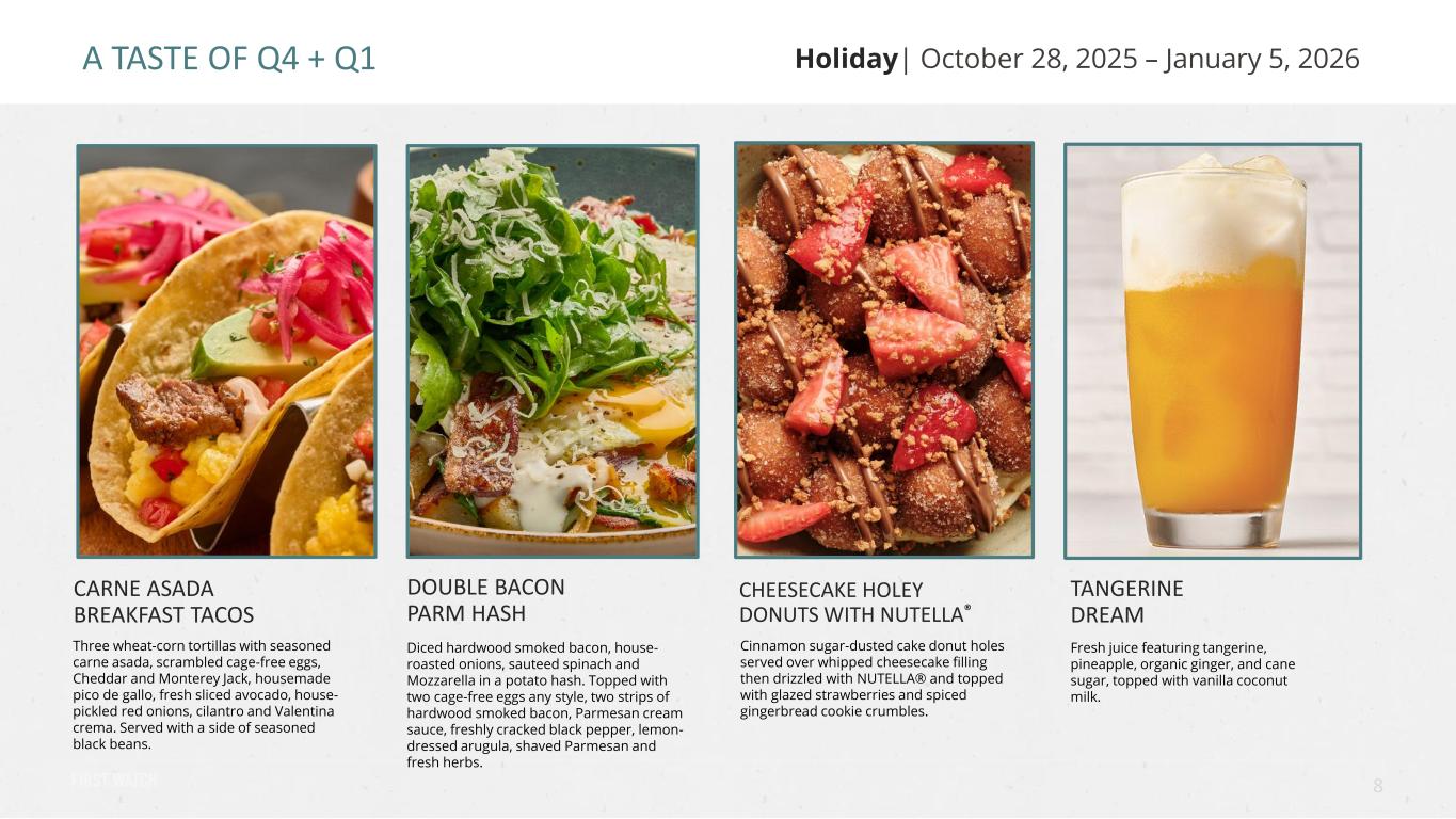 Holiday| October 28, 2025 – January 5, 2026 8 Three wheat-corn tortillas with seasoned carne asada, scrambled cage-free eggs, Cheddar and Monterey Jack, housemade pico de gallo, fresh sliced avocado, house- pickled red onions, cilantro and Valentina crema. Served with a side of seasoned black beans. Diced hardwood smoked bacon, house- roasted onions, sauteed spinach and Mozzarella in a potato hash. Topped with two cage-free eggs any style, two strips of hardwood smoked bacon, Parmesan cream sauce, freshly cracked black pepper, lemon- dressed arugula, shaved Parmesan and fresh herbs. Cinnamon sugar-dusted cake donut holes served over whipped cheesecake filling then drizzled with NUTELLA® and topped with glazed strawberries and spiced gingerbread cookie crumbles. TANGERINE DREAM Fresh juice featuring tangerine, pineapple, organic ginger, and cane sugar, topped with vanilla coconut milk. CARNE ASADA BREAKFAST TACOS DOUBLE BACON PARM HASH CHEESECAKE HOLEY DONUTS WITH NUTELLA® A TASTE OF Q4 + Q1