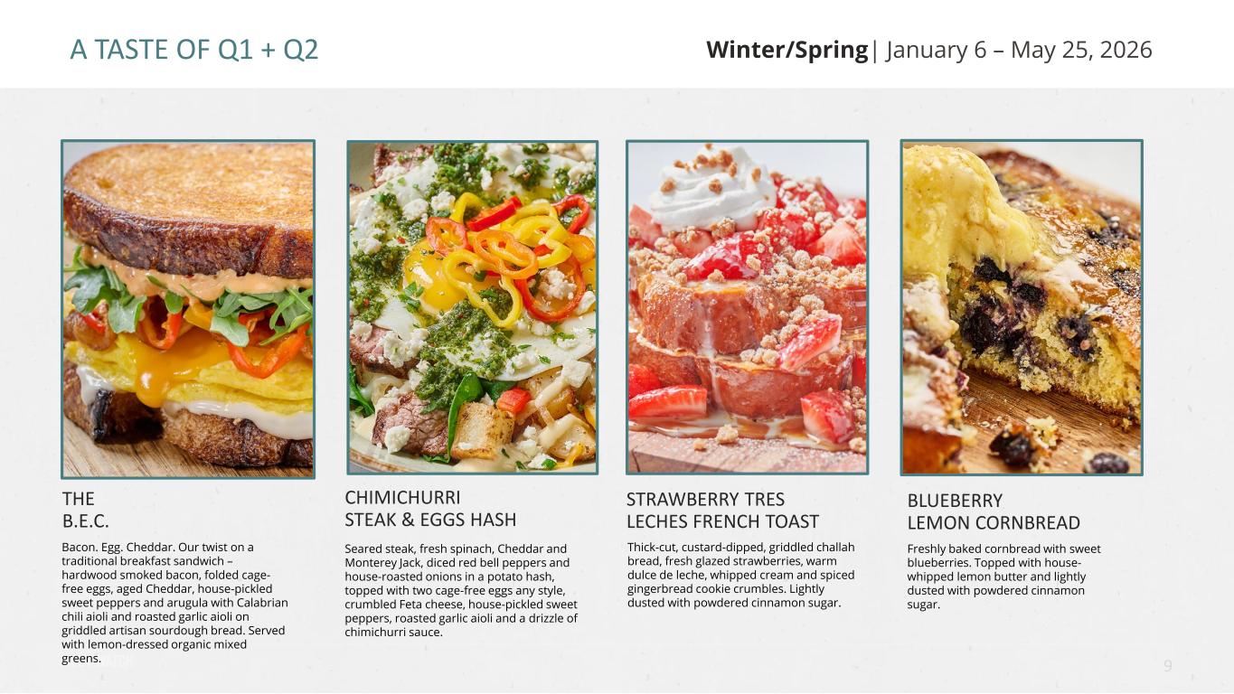 Winter/Spring| January 6 – May 25, 2026 9 Bacon. Egg. Cheddar. Our twist on a traditional breakfast sandwich – hardwood smoked bacon, folded cage- free eggs, aged Cheddar, house-pickled sweet peppers and arugula with Calabrian chili aioli and roasted garlic aioli on griddled artisan sourdough bread. Served with lemon-dressed organic mixed greens. Seared steak, fresh spinach, Cheddar and Monterey Jack, diced red bell peppers and house-roasted onions in a potato hash, topped with two cage-free eggs any style, crumbled Feta cheese, house-pickled sweet peppers, roasted garlic aioli and a drizzle of chimichurri sauce. Thick-cut, custard-dipped, griddled challah bread, fresh glazed strawberries, warm dulce de leche, whipped cream and spiced gingerbread cookie crumbles. Lightly dusted with powdered cinnamon sugar. BLUEBERRY LEMON CORNBREAD Freshly baked cornbread with sweet blueberries. Topped with house- whipped lemon butter and lightly dusted with powdered cinnamon sugar. THE B.E.C. CHIMICHURRI STEAK & EGGS HASH STRAWBERRY TRES LECHES FRENCH TOAST A TASTE OF Q1 + Q2