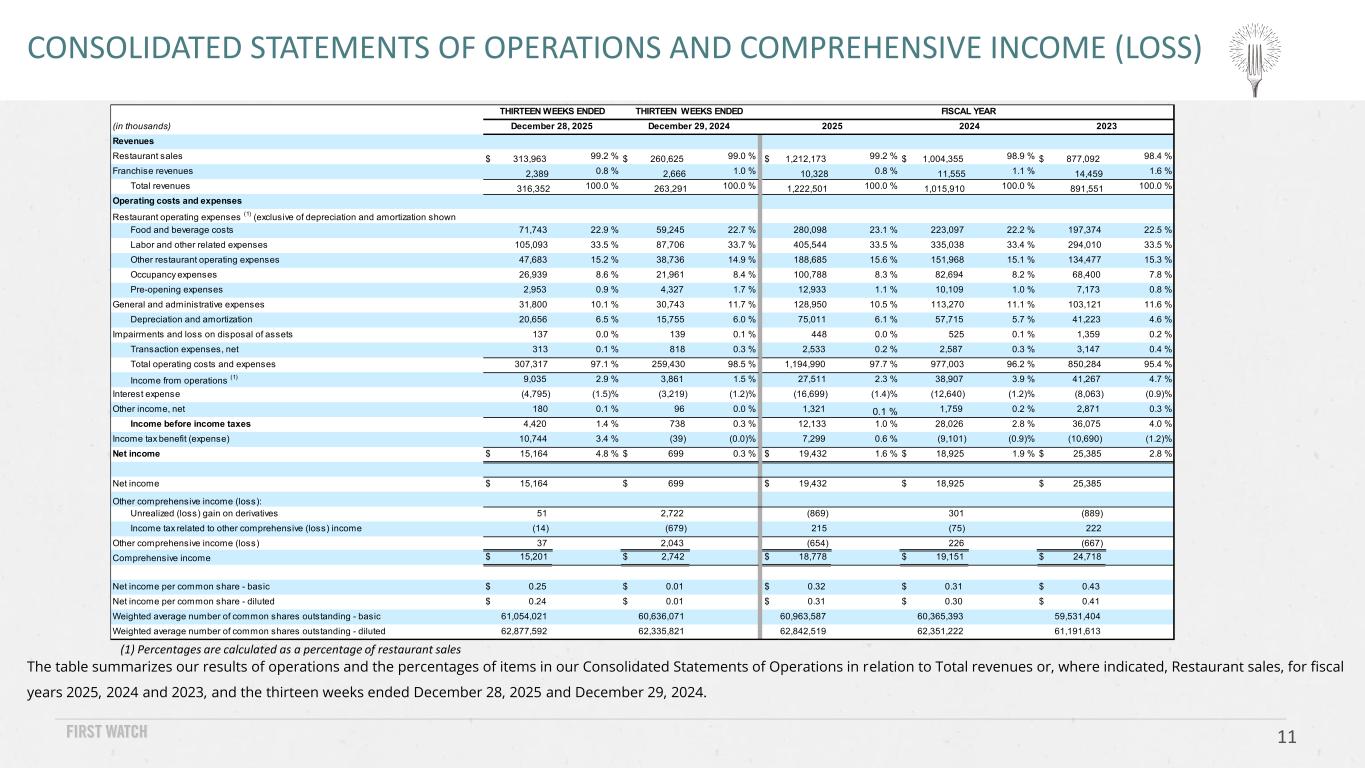 11 The table summarizes our results of operations and the percentages of items in our Consolidated Statements of Operations in relation to Total revenues or, where indicated, Restaurant sales, for fiscal years 2025, 2024 and 2023, and the thirteen weeks ended December 28, 2025 and December 29, 2024. CONSOLIDATED STATEMENTS OF OPERATIONS AND COMPREHENSIVE INCOME (LOSS) (1) Percentages are calculated as a percentage of restaurant sales (in thousands) Revenues Restaurant sales $ 313,963 99.2 % $ 260,625 99.0 % $ 1,212,173 99.2 % $ 1,004,355 98.9 % $ 877,092 98.4 % Franchise revenues 2,389 0.8 % 2,666 1.0 % 10,328 0.8 % 11,555 1.1 % 14,459 1.6 % Total revenues 316,352 100.0 % 263,291 100.0 % 1,222,501 100.0 % 1,015,910 100.0 % 891,551 100.0 % Operating costs and expenses Restaurant operating expenses (1) (exclusive of depreciation and amortization shown below):Food and beverage costs 71,743 22.9 % 59,245 22.7 % 280,098 23.1 % 223,097 22.2 % 197,374 22.5 % Labor and other related expenses 105,093 33.5 % 87,706 33.7 % 405,544 33.5 % 335,038 33.4 % 294,010 33.5 % Other restaurant operating expenses 47,683 15.2 % 38,736 14.9 % 188,685 15.6 % 151,968 15.1 % 134,477 15.3 % Occupancy expenses 26,939 8.6 % 21,961 8.4 % 100,788 8.3 % 82,694 8.2 % 68,400 7.8 % Pre-opening expenses 2,953 0.9 % 4,327 1.7 % 12,933 1.1 % 10,109 1.0 % 7,173 0.8 % General and administrative expenses 31,800 10.1 % 30,743 11.7 % 128,950 10.5 % 113,270 11.1 % 103,121 11.6 % Depreciation and amortization 20,656 6.5 % 15,755 6.0 % 75,011 6.1 % 57,715 5.7 % 41,223 4.6 % Impairments and loss on disposal of assets 137 0.0 % 139 0.1 % 448 0.0 % 525 0.1 % 1,359 0.2 % Transaction expenses, net 313 0.1 % 818 0.3 % 2,533 0.2 % 2,587 0.3 % 3,147 0.4 % Total operating costs and expenses 307,317 97.1 % 259,430 98.5 % 1,194,990 97.7 % 977,003 96.2 % 850,284 95.4 % Income from operations (1) 9,035 2.9 % 3,861 1.5 % 27,511 2.3 % 38,907 3.9 % 41,267 4.7 % Interest expense (4,795) (1.5)% (3,219) (1.2)% (16,699) (1.4)% (12,640) (1.2)% (8,063) (0.9)% Other income, net 180 0.1 % 96 0.0 % 1,321 0.1 % 1,759 0.2 % 2,871 0.3 % Income before income taxes 4,420 1.4 % 738 0.3 % 12,133 1.0 % 28,026 2.8 % 36,075 4.0 % Income tax benefit (expense) 10,744 3.4 % (39) (0.0)% 7,299 0.6 % (9,101) (0.9)% (10,690) (1.2)% Net income $ 15,164 4.8 % $ 699 0.3 % $ 19,432 1.6 % $ 18,925 1.9 % $ 25,385 2.8 % Net income $ 15,164 $ 699 $ 19,432 $ 18,925 $ 25,385 Other comprehensive income (loss): Unrealized (loss) gain on derivatives 51 2,722 (869) 301 (889) Income tax related to other comprehensive (loss) income (14) (679) 215 (75) 222 Other comprehensive income (loss) 37 2,043 (654) 226 (667) Comprehensive income $ 15,201 $ 2,742 $ 18,778 $ 19,151 $ 24,718 Net income per common share - basic $ 0.25 $ 0.01 $ 0.32 $ 0.31 $ 0.43 Net income per common share - diluted $ 0.24 $ 0.01 $ 0.31 $ 0.30 $ 0.41 Weighted average number of common shares outstanding - basic 61,054,021 60,636,071 60,963,587 60,365,393 59,531,404 Weighted average number of common shares outstanding - diluted 62,877,592 62,335,821 62,842,519 62,351,222 61,191,613 THIRTEEN WEEKS ENDED December 28, 2025 THIRTEEN WEEKS ENDED December 29, 2024 2025 FISCAL YEAR 2024 2023