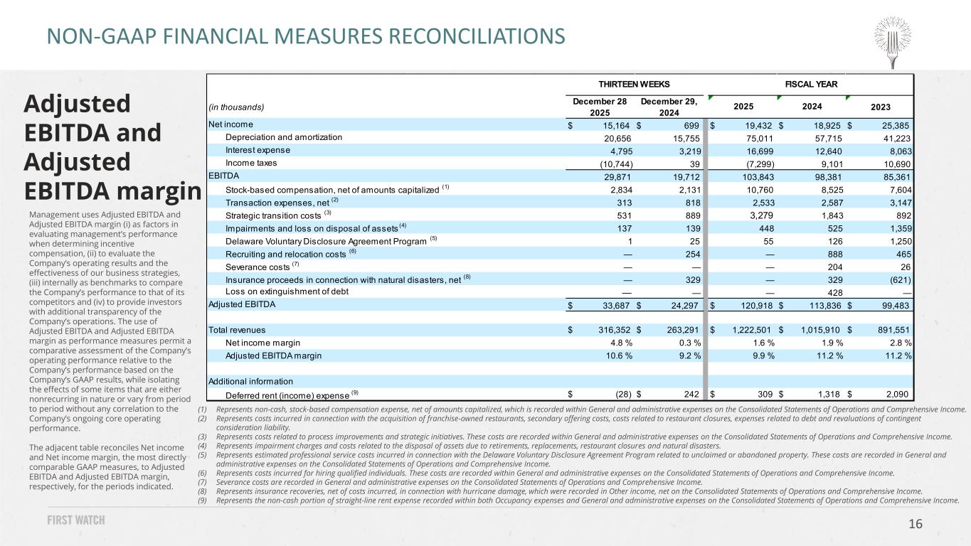 16 Management uses Adjusted EBITDA and Adjusted EBITDA margin (i) as factors in evaluating management’s performance when determining incentive compensation, (ii) to evaluate the Company’s operating results and the effectiveness of our business strategies, (iii) internally as benchmarks to compare the Company’s performance to that of its competitors and (iv) to provide investors with additional transparency of the Company’s operations. The use of Adjusted EBITDA and Adjusted EBITDA margin as performance measures permit a comparative assessment of the Company’s operating performance relative to the Company’s performance based on the Company’s GAAP results, while isolating the effects of some items that are either nonrecurring in nature or vary from period to period without any correlation to the Company’s ongoing core operating performance. The adjacent table reconciles Net income and Net income margin, the most directly comparable GAAP measures, to Adjusted EBITDA and Adjusted EBITDA margin, respectively, for the periods indicated. NON-GAAP FINANCIAL MEASURES RECONCILIATIONS Adjusted EBITDA and Adjusted EBITDA margin (1) Represents non-cash, stock-based compensation expense, net of amounts capitalized, which is recorded within General and administrative expenses on the Consolidated Statements of Operations and Comprehensive Income. (2) Represents costs incurred in connection with the acquisition of franchise-owned restaurants, secondary offering costs, costs related to restaurant closures, expenses related to debt and revaluations of contingent consideration liability. (3) Represents costs related to process improvements and strategic initiatives. These costs are recorded within General and administrative expenses on the Consolidated Statements of Operations and Comprehensive Income. (4) Represents impairment charges and costs related to the disposal of assets due to retirements, replacements, restaurant closures and natural disasters. (5) Represents estimated professional service costs incurred in connection with the Delaware Voluntary Disclosure Agreement Program related to unclaimed or abandoned property. These costs are recorded in General and administrative expenses on the Consolidated Statements of Operations and Comprehensive Income. (6) Represents costs incurred for hiring qualified individuals. These costs are recorded within General and administrative expenses on the Consolidated Statements of Operations and Comprehensive Income. (7) Severance costs are recorded in General and administrative expenses on the Consolidated Statements of Operations and Comprehensive Income. (8) Represents insurance recoveries, net of costs incurred, in connection with hurricane damage, which were recorded in Other income, net on the Consolidated Statements of Operations and Comprehensive Income. (9) Represents the non-cash portion of straight-line rent expense recorded within both Occupancy expenses and General and administrative expenses on the Consolidated Statements of Operations and Comprehensive Income. (in thousands) December 28 2025 December 29, 2024 2023 Net income $ 15,164 $ 699 $ 19,432 $ 18,925 $ 25,385 Depreciation and amortization 20,656 15,755 75,011 57,715 41,223 Interest expense 4,795 3,219 16,699 12,640 8,063 Income taxes (10,744) 39 (7,299) 9,101 10,690 EBITDA 29,871 19,712 103,843 98,381 85,361 Stock-based compensation, net of amounts capitalized (1) 2,834 2,131 10,760 8,525 7,604 Transaction expenses, net (2) 313 818 2,533 2,587 3,147 Strategic transition costs (3) 531 889 3,279 1,843 892 Impairments and loss on disposal of assets (4) 137 139 448 525 1,359 Delaware Voluntary Disclosure Agreement Program (5) 1 25 55 126 1,250 Recruiting and relocation costs (6) — 254 — 888 465 Severance costs (7) — — — 204 26 Insurance proceeds in connection with natural disasters, net (8) — 329 — 329 (621) Loss on extinguishment of debt — — — 428 — Adjusted EBITDA $ 33,687 $ 24,297 $ 120,918 $ 113,836 $ 99,483 Total revenues $ 316,352 $ 263,291 $ 1,222,501 $ 1,015,910 $ 891,551 Net income margin 4.8 % 0.3 % 1.6 % 1.9 % 2.8 % Adjusted EBITDA margin 10.6 % 9.2 % 9.9 % 11.2 % 11.2 % Additional information Deferred rent (income) expense (9) $ (28) $ 242 $ 309 $ 1,318 $ 2,090 THIRTEEN WEEKS 2025 2024 FISCAL YEAR