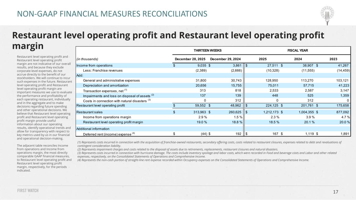 17 Restaurant level operating profit and Restaurant level operating profit margin are not indicative of our overall results, and because they exclude corporate-level expenses, do not accrue directly to the benefit of our stockholders. We will continue to incur such expenses in the future. Restaurant level operating profit and Restaurant level operating profit margin are important measures we use to evaluate the performance and profitability of each operating restaurant, individually and in the aggregate and to make decisions regarding future spending and other operational decisions. We believe that Restaurant level operating profit and Restaurant level operating profit margin provide useful information about our operating results, identify operational trends and allow for transparency with respect to key metrics used by us in our financial and operational decision-making. The adjacent table reconciles Income from operations and Income from operations margin, the most directly comparable GAAP financial measures, to Restaurant level operating profit and Restaurant level operating profit margin, respectively, for the periods indicated. Restaurant level operating profit and Restaurant level operating profit margin NON-GAAP FINANCIAL MEASURES RECONCILIATIONS (1) Represents costs incurred in connection with the acquisition of franchise-owned restaurants, secondary offering costs, costs related to restaurant closures, expenses related to debt and revaluations of contingent consideration liability. (2) Represents impairment charges and costs related to the disposal of assets due to retirements, replacements, restaurant closures and natural disasters. (3) Represents costs incurred in connection with hurricane damage. The costs include inventory spoilage and labor costs, which were recorded in Food and beverage costs and Labor and other related expenses, respectively, on the Consolidated Statements of Operations and Comprehensive Income. (4) Represents the non-cash portion of straight-line rent expense recorded within Occupancy expenses on the Consolidated Statements of Operations and Comprehensive Income. (in thousands) December 28, 2025 December 29, 2024 2025 2024 2023 Income from operations $ 9,035 $ 3,861 $ 27,511 $ 38,907 $ 41,267 Less: Franchise revenues (2,389) (2,666) (10,328) (11,555) (14,459) Add: General and administrative expenses 31,800 30,743 128,950 113,270 103,121 Depreciation and amortization 20,656 15,755 75,011 57,715 41,223 Transaction expenses, net (1) 313 818 2,533 2,587 3,147 Impairments and loss on disposal of assets (2) 137 139 448 525 1,359 Costs in connection with natural disasters (3) 0 312 0 312 0 Restaurant level operating profit $ 59,552 $ 48,962 $ 224,125 $ 201,761 $ 175,658 Restaurant sales $ 313,963 $ 260,625 $ 1,212,173 $ 1,004,355 $ 877,092 Income from operations margin 2.9 % 1.5 % 2.3 % 3.9 % 4.7 % Restaurant level operating profit margin 19.0 % 18.8 % 18.5 % 20.1 % 20.0 % Additional information Deferred rent (income) expense (4) $ (44) $ 192 $ 167 $ 1,119 $ 1,891 THIRTEEN WEEKS FISCAL YEAR